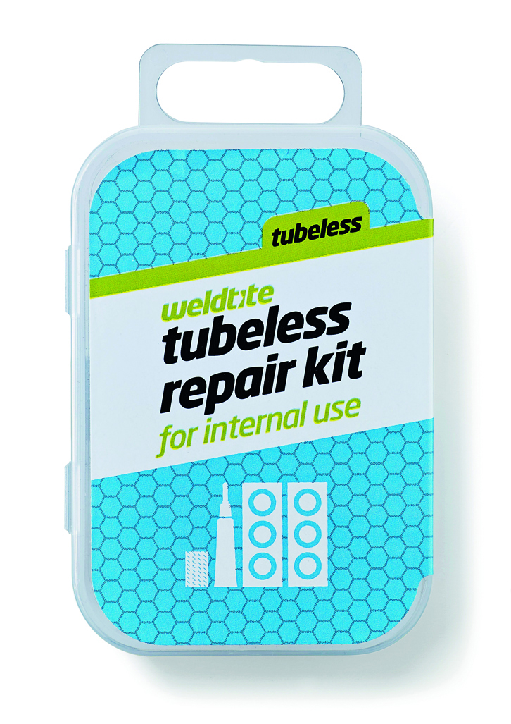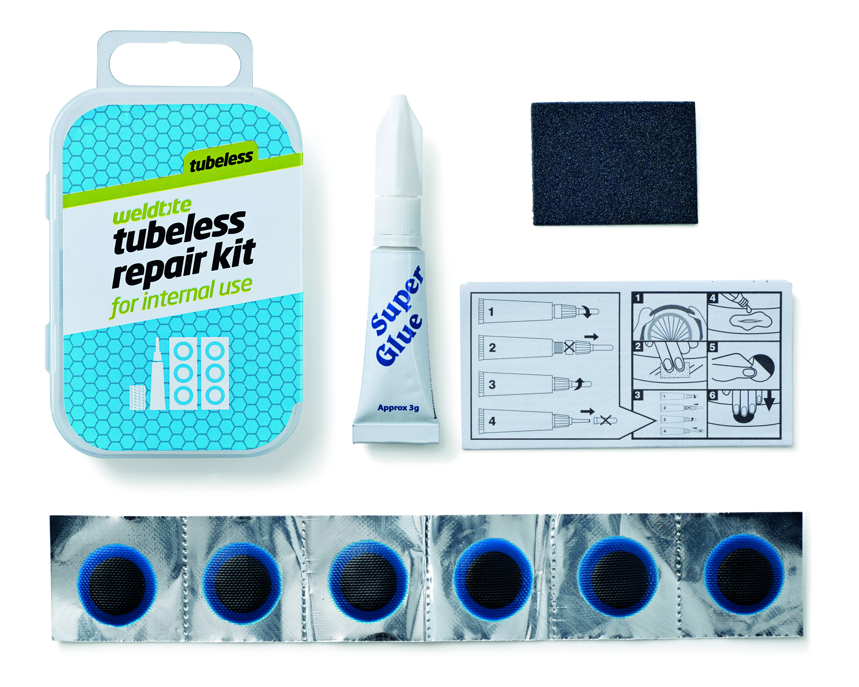 Аптечка Weldtite для ремонта бескамерных покрышек. Логика использования аптечки аналогична классическому ремонтному набору для камер. Необходимо разбортировать покрышку, зашкурить область со внутренней стороны вокруг пореза наждачкой, нанести клей и тщательно прижать заплатку. Все вышеперечисленные инструменты входят в данный комплект и укладываются в компактный кейс, который удобно возить с собой.- 6 заплаток