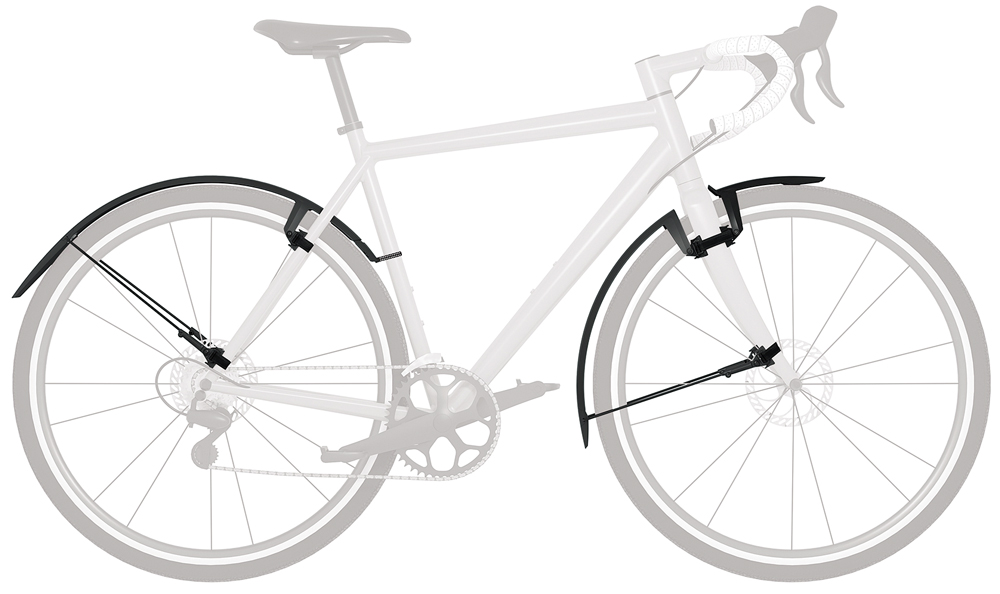 Комплект полнопрофильных быстросъемных крыльев SKS Speedrocker XL, разработанный специально для гравийных и циклокроссовых велосипедов c дисковыми тормозами. Крылья выполнены из ударопрочного пластика и устанавливаются на вилку и раму велосипеда при помощи быстросъемных стреп с контактной поверхностью, не повреждающей лакокрасочное покрытие рамы. Заднее крыло может быть точно подогнано при помощи регулируемых стоек.