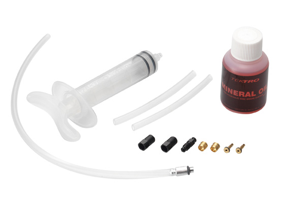 Набор для прокачки гидравлических тормозов Tektro. Набор включает в себя: шприц, переходники/адаптеры, шланги, минеральное масло 50 мл, для гидравлических дисковых тормозов TEKTRO с минеральным маслом.