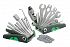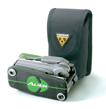 Компактный набор серии Alien с 25 инструментами для полевого ремонта велосипеда. Стальная база корпуса, пластиковые накладки, инструменты хром-молибденовая и легированные стали. Набор включает: шестигранники 2-L/2.5/3/4/5/6/8/10 мм, Torx T25, накидные ключи 8-9-10 мм, 4 спицевых ключа 14 g/15 g/Mavic/Shimano, выжимка цепи (до 10 скоростей) с крючком для сведения звеньев, монтажка для покрышек, крестовая отвертка Phillips, плоская отвертка, нож, открывашка. два отделения для запасных осей цепи, проставка для калипера гидравлических тормозов. Плотный нейлоновый чехол.