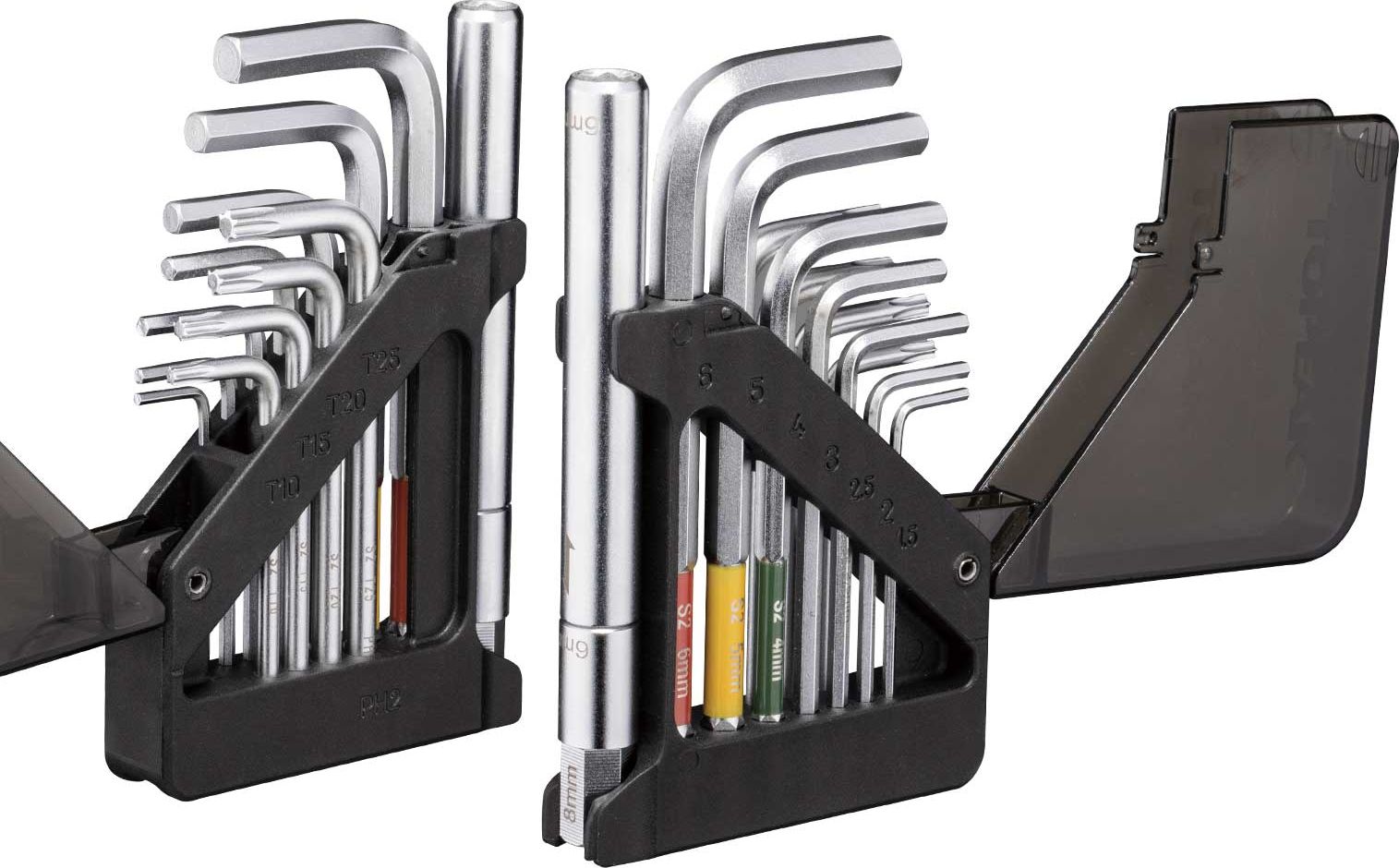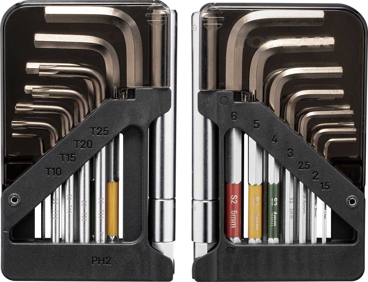 Уникальный набор шестигранных ключей с шариковыми наконечниками на 15 функций. Ключи хранятся в инновационном складном корпусе-органайзере, который достаточно мал, чтобы поместиться в кармане джерси или подседельной сумке. Для удобства работы в труднодоступных местах комплектуется удлинителем.