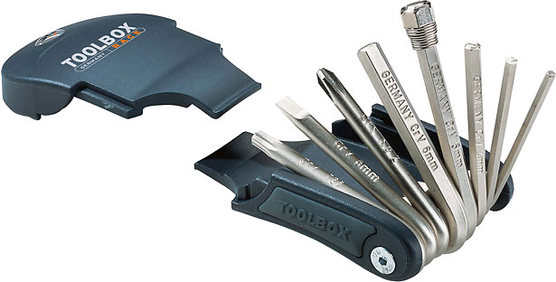 TOOLBOX RACE - компактный набор инструментов в неопреновом чехле и закрытом корпусе. Возможно крепление к ремню. Скругленная форма исключает возможные травмы при перевозке в заднем нательном кармане. Набор шестигранников, монтажки, крестовая и плоские отвертки, Torx для обслуживания болтов тормозных дисков. Хром-ванадиевая сталь, сделано в Германии.