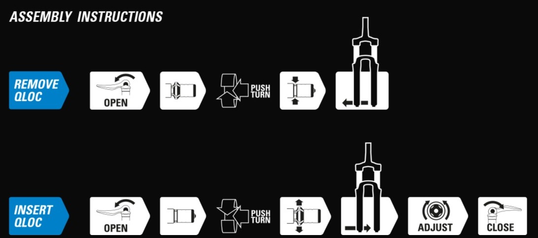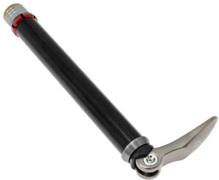 Сквозная ось для амортизационных вилок производства SR Suntour. Совмещение эксцентрика и распорного механизма с гайкой позволяют быстро вдеть и вытащить ось из любой втулки без инструмента, сохраняя возможность регулировки усилия затяжки.