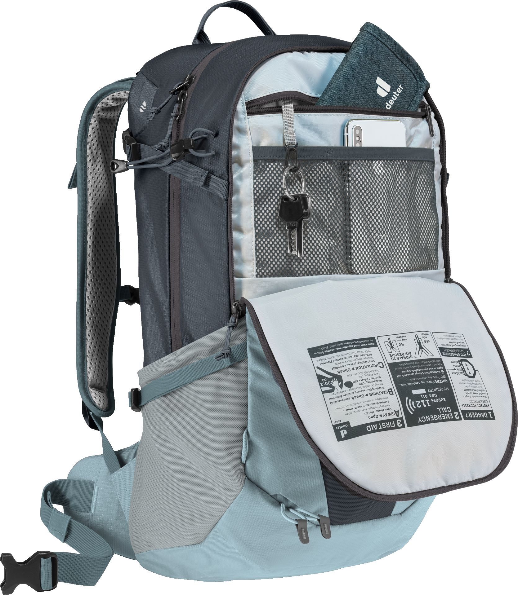- Deuter Aircomfort - гибкий подпружиненный стальной каркас, чрезвычайно прочен, обеспечивает равномерное натяжение сетки на спинке рюкзака и создаёт пространство для вентиляции между рюкзаком и спиной; значительно снижает перегрев, уменьшая нагрузку на организм и повышая выносливость.