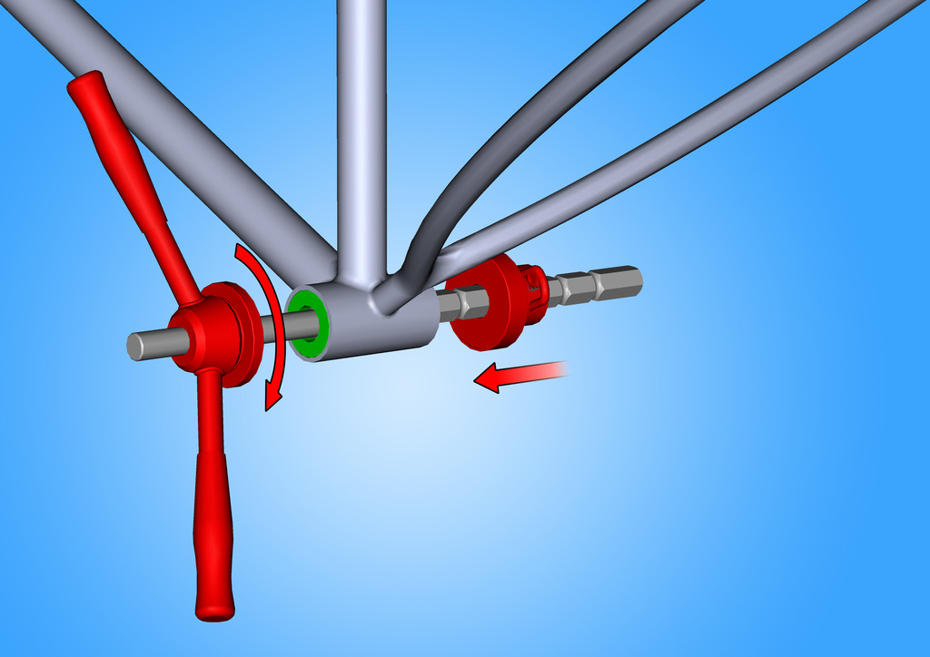 Съемник кареток типа BB90 Unior 1625/2BB90. Инструмент предназначен для снятия подшипников и чашек с безрезьбовых кареток системы BB90. Также подходит для использования на осях 24 мм, таких, как у систем BB86, BB92, SRAM Press Fit GXP. Инструмент позволяет снять подшипники и чашку с рамы. Осторожно установите направляющую головки съёмника на чашку (отмечено зелёным).