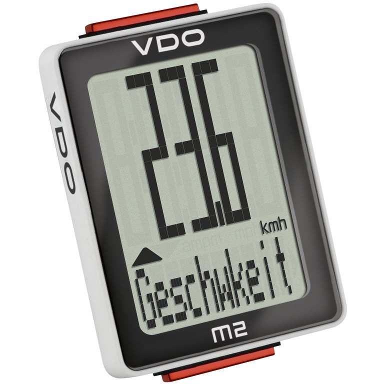 Простой проводной велокомпьютер VDO с расширенным набором функций. Влагозащищенный корпус, сохранение данных при быстрой замене батареи, двухстрочный дисплей, индикатор разряда батареи. Постоянная память на общий пробег велосипеда, суммарное время поездки и диаметр колеса. Выпускается в беспроводной модификации VDO M2 WL. Характеристики выводимые на дисплей:- текущая скорость