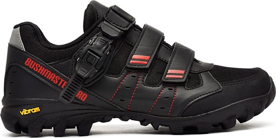 Туфли Bushmaster Pro, оснащенные подошвой Vibram MTBike, специально разработаны для пеших и велосипедных прогулок и гарантируют максимальную защиту и сцепление. Благодаря боковым шипам и консистенции резины достигается максимальное сцепление с поверхностью, а также амортизация и удобство посадки на стопе. Верх туфель изготовлен из прочной, легкой, водостойкой искусственной кожи с усиленным кожаным мыском и широкими нейлоновыми сетчатыми панелями для дополнительной вентиляции. Для точной подгонки Bushamster Pro оснащены парой ремешков с липучкой велькро и верхней стрепой с храповым механизмом для прочной фиксации обуви на стопе.