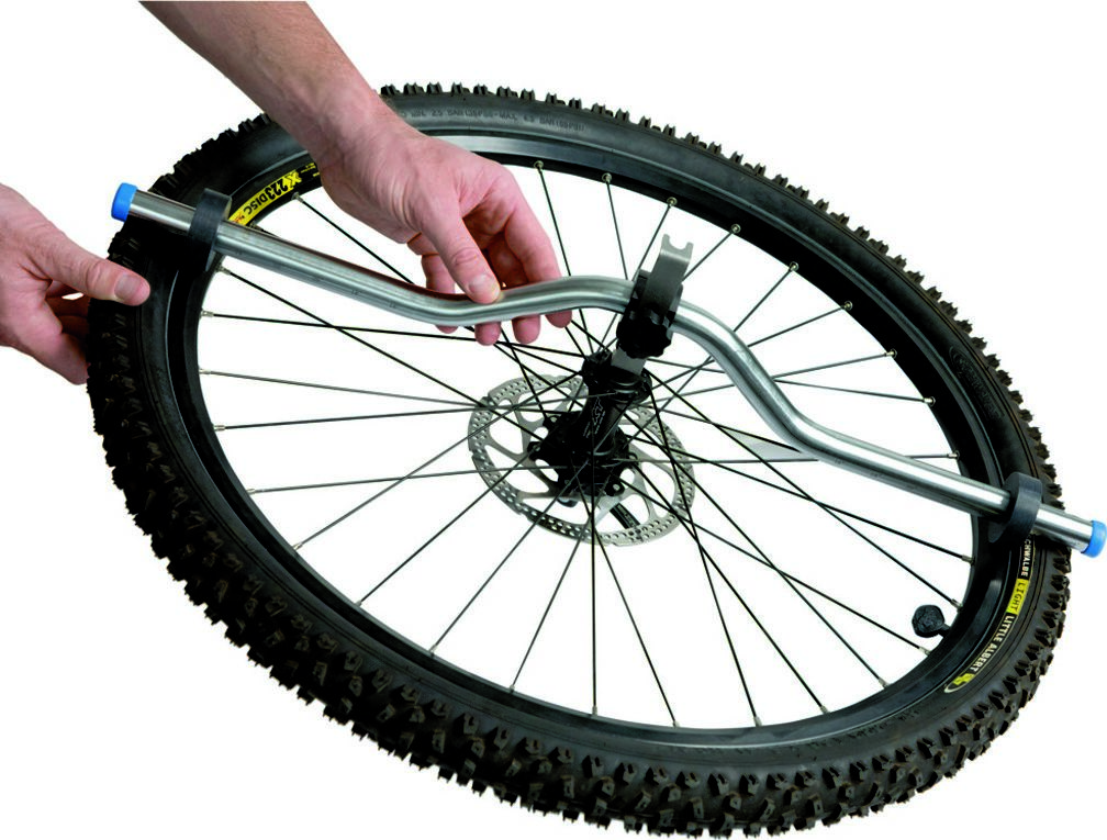 Зонтомер – инструмент, предназначенный для проверки симметрии между втулкой и ободом колеса. Сначала необходимо установить соответствующий интервал между скользящими метками (справа и слева) в соответствии с размером колеса так, чтобы они касались обода. Затем необходимо выдвинуть металлическую планку к месту крепления колеса в раме. Далее следует зафиксировать суппорт болтом и проверить другую сторону колеса. Это позволит нам увидеть, насколько втулка центрирована по отношению к ободу. Если колесо не центрировано, то необходима регулировка.